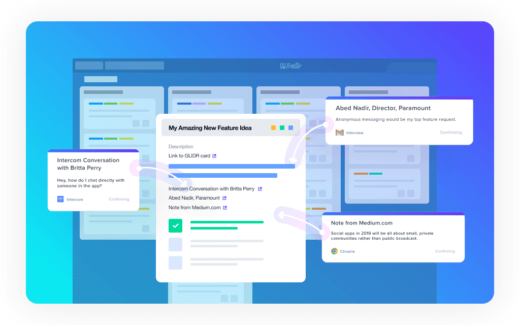 Support Ideas throughout the entire product development process with full product definition and links to connected GLIDR Evidence in Trello. Maintain context as ideas become features and share direct customer feedback with engineers.